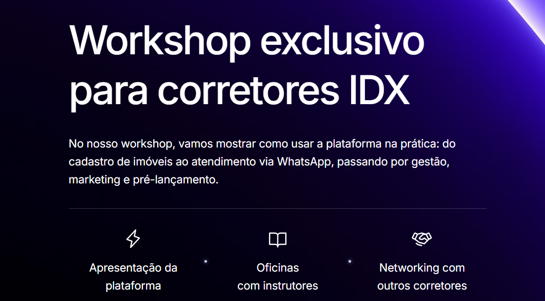Corretores de imóveis da Paraíba terão a oportunidade de participar gratuitamente do 1º Workshop Imobiliário IDX Brasil, que será realizado no dia 29 de julho, no Centro Cultural Ariano Suassuna, em João Pessoa. O evento é promovido pela startup paraibana IDX Brasil e contará com oficinas práticas, palestras, networking e entrega de certificados.